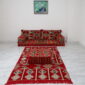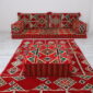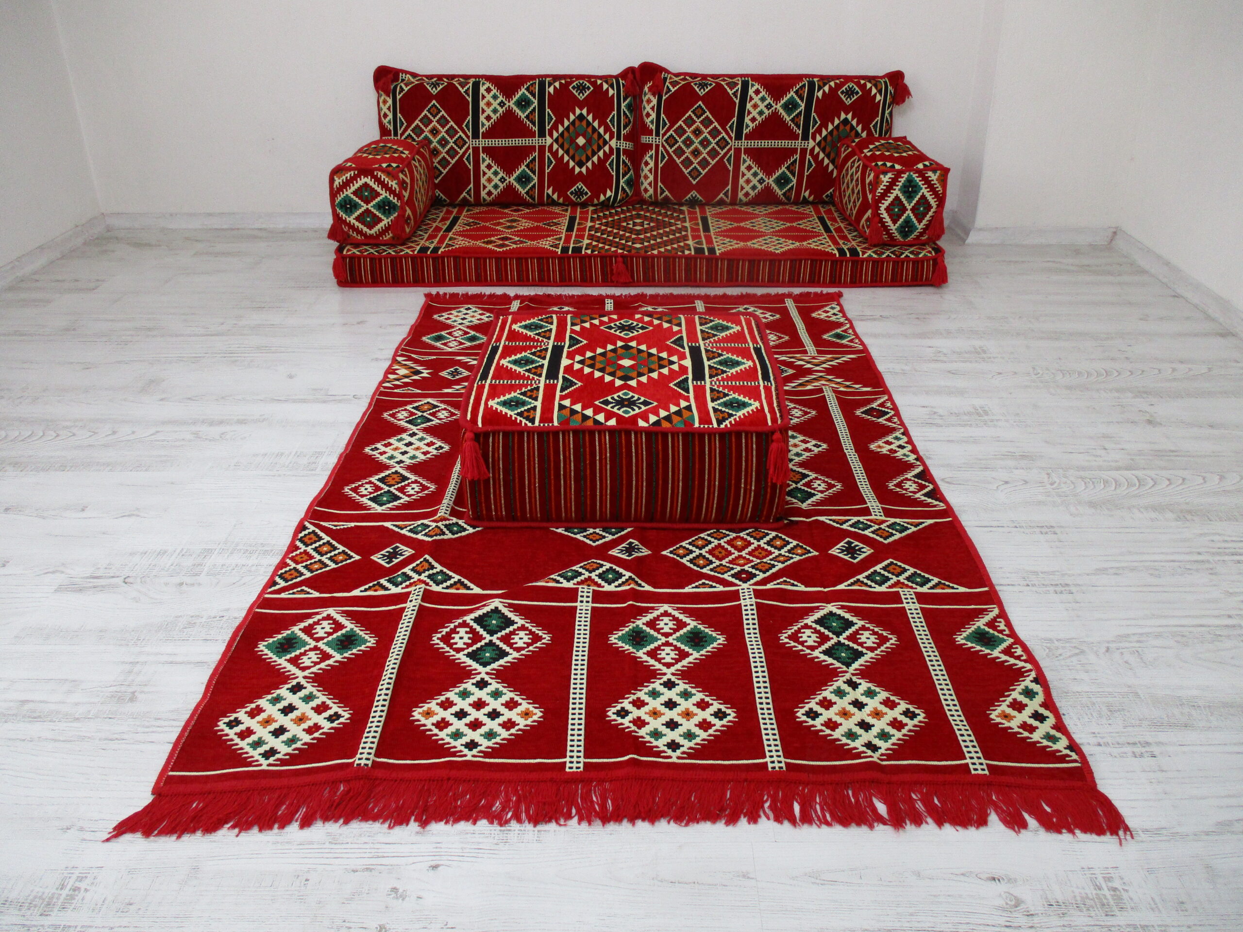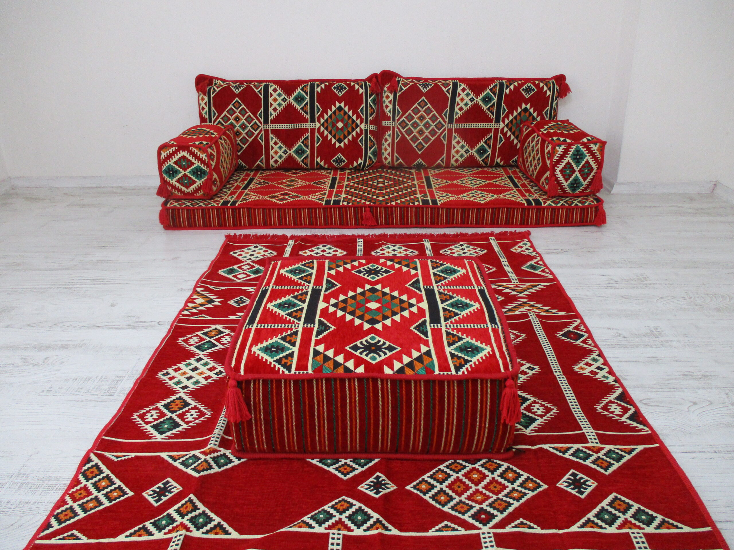 Majlis Sofa, This floor sofa set contains 1 floor seating couch, 2 backrest pillows, 2 armrest pillows, 1 ottoman, 1 rug.