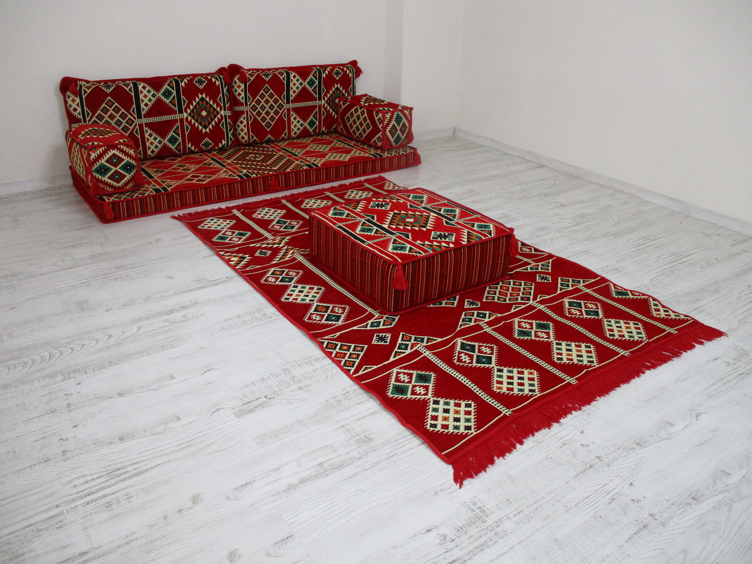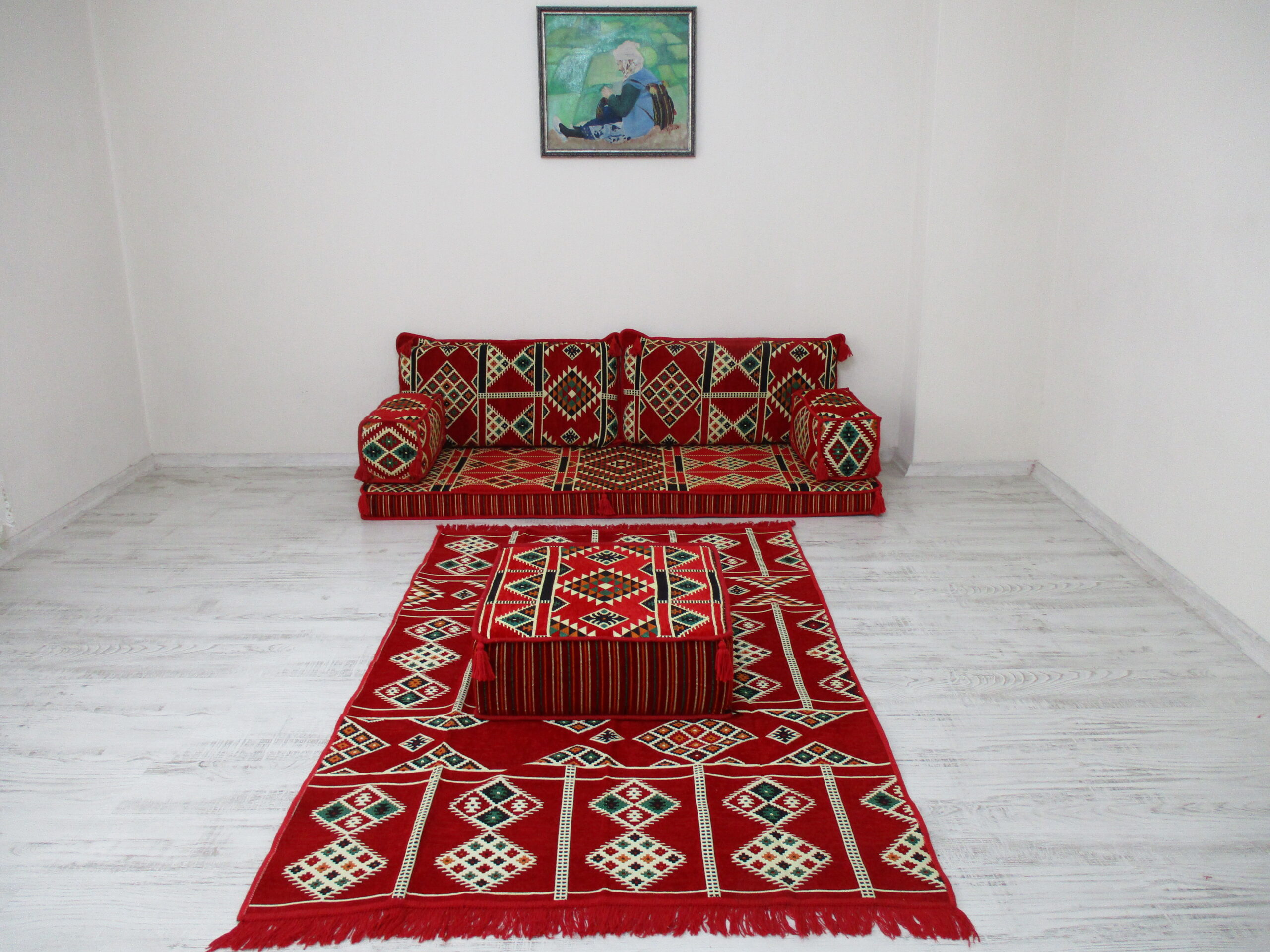- This floor sofa set contains 1 floor seating couch, 2 backrest pillows, 2 armrest pillows, 1 ottoman, 1 rug